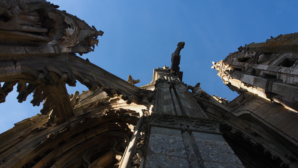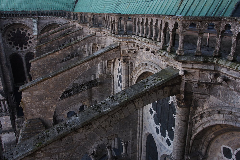 Aber Chartres hat etwas Besonderes: Ein Modell für alle anderen gotischen Kirchen dieser Welt. Diese Vorstellung finde ich schon ungeheuer beeindruckend. Vorher gab es das nicht: Säulen, die in den Himmel streben, Wände, die mit Glasfenstern durchlässig gemacht sind und Licht in den Bau lassen. In einem Reiseführer lese ich: „Die Erbauer der Kathedrale haben nicht nur mit Erfahrung, handwerklicher Meisterschaft, Berechnung gearbeitet. Ausschlaggebend war der Drang, die Seele des Menschen aufzurichten und ihn von der Erdenschwere zu befreien. In der mittelalterlichen Vorstellungswelt symbolisierte die Kathedrale die himmlische Gottesstadt. Ein himmlisches Jerusalem, das das Kirchenvolk in seine schützenden Mauern aufnimmt.“