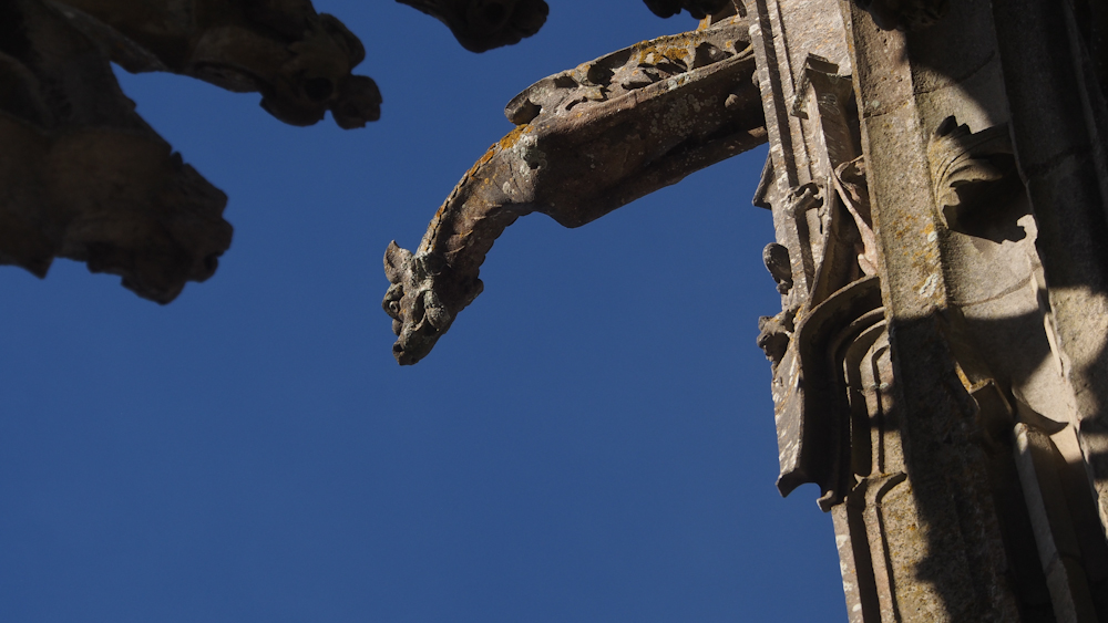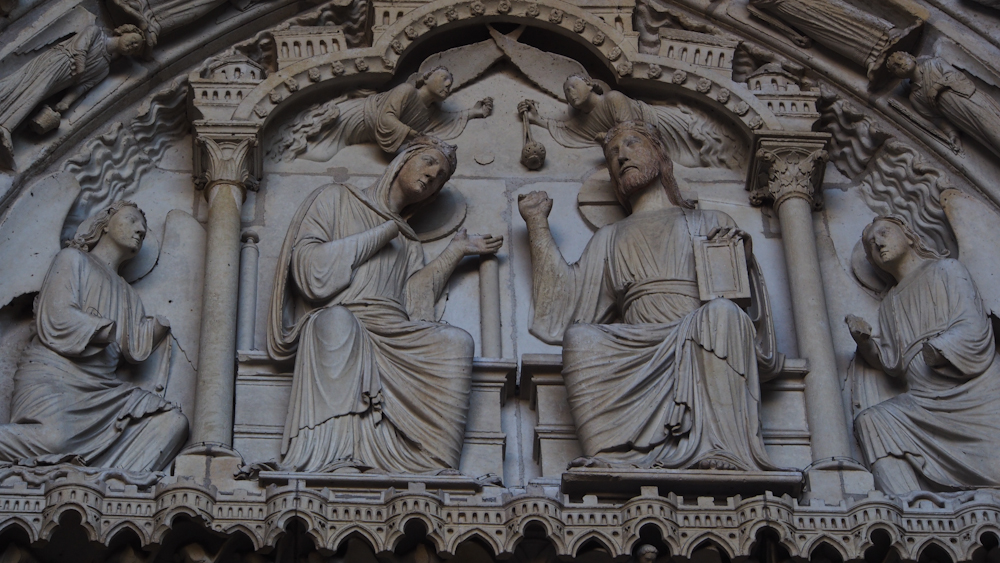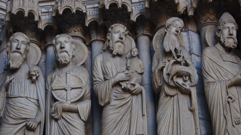 Ebenso beeindruckend wie den Kirchenbau an sich sind die Skulpturen in den Portalen an der Außenwand. Lange, schlanke Gestalten mit fein gearbeiteten, ganz individuellen Gesichtern. Und jede dieser Figuren erzählt eine Geschichte aus der Bibel. Antje versucht, mit Hilfe ihrer mitgebrachten Bücher dem mythologischen Gehalt mancher dieser Gestalten nahe zu kommen. Ich glaube, man kann Wochen, Monate, Jahre hier verbringen und immer noch Neues entdecken.