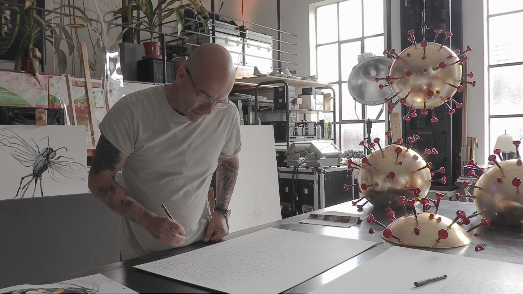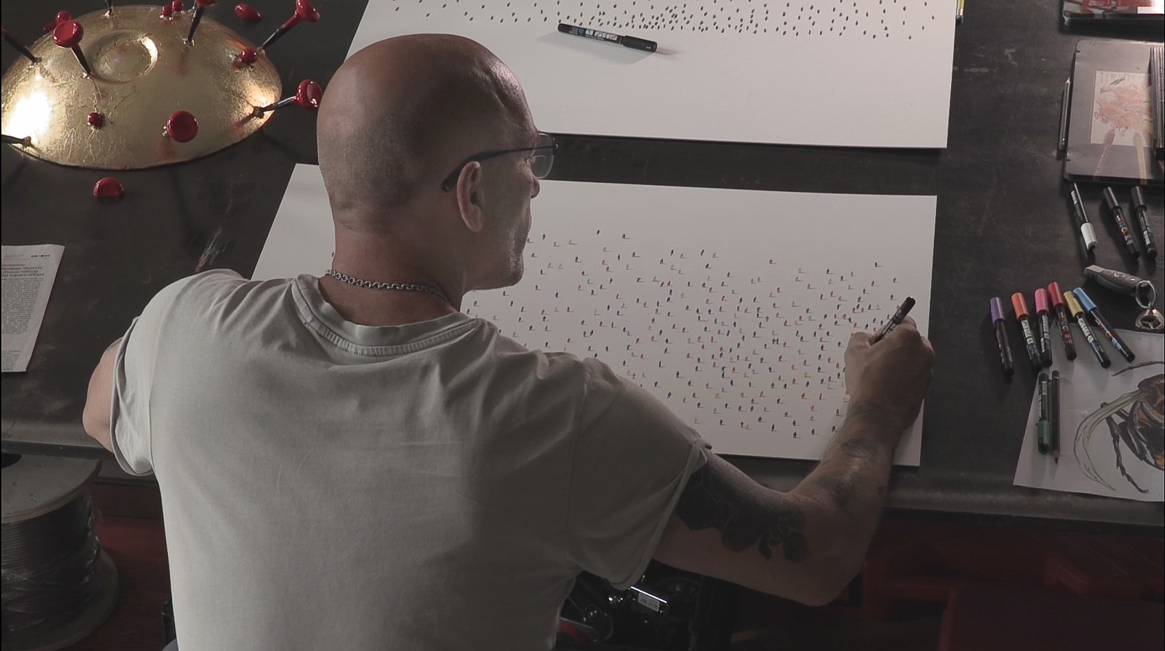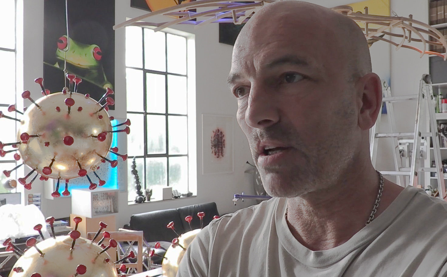 Und nun zum konkreten Anlass: Andreas Enrique Furtwängler arbeitet während der Aufnahmen an einem Bild. Dieses Werk spendet er an die Wohngemeinschaft junger Menschen mit hohem Hilfebedarf im City Quartier Böblingen. Im Rahmen der Böblinger Businesswochen wird dieses Bild von Volker Siegle am 16. Oktober 2020 versteigert.