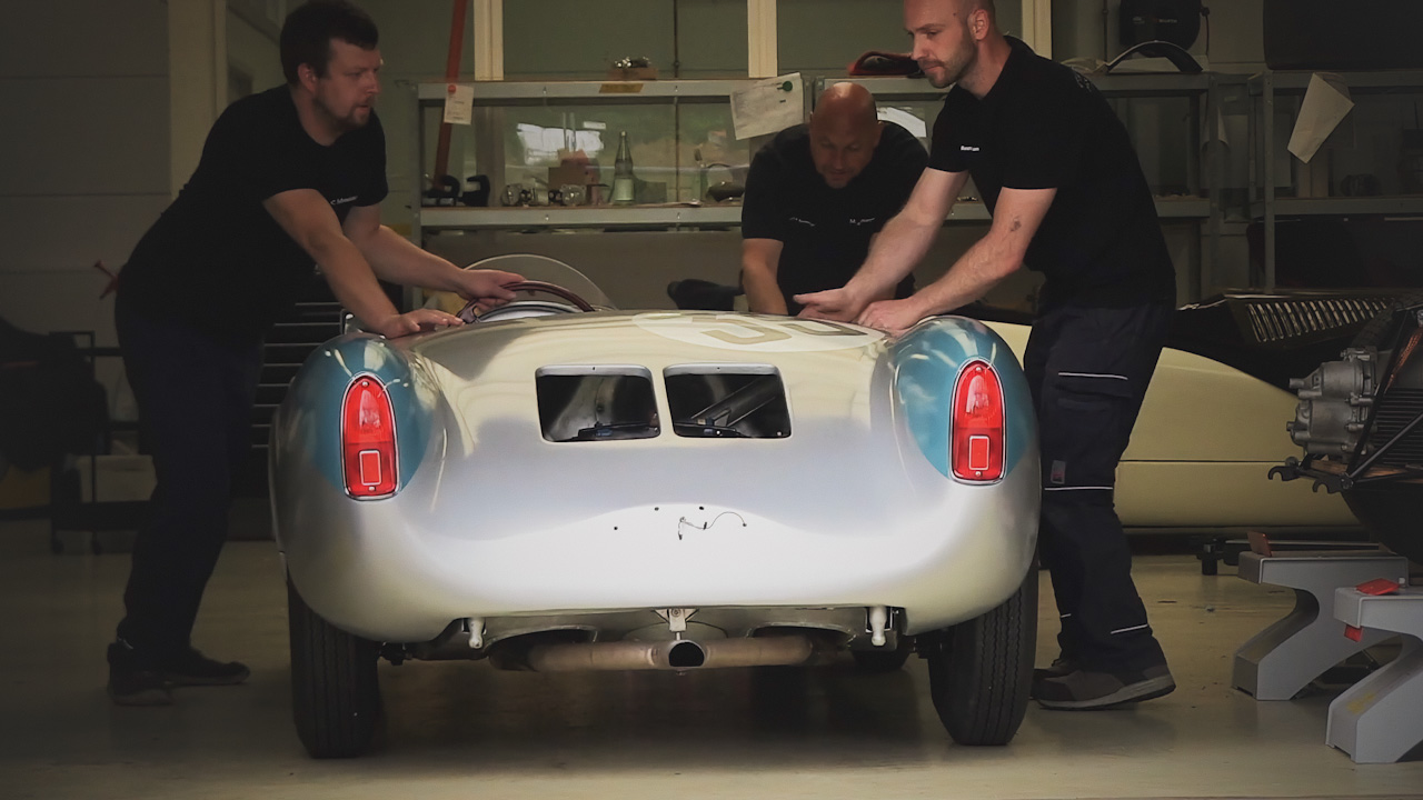 Over almost 25 minutes, the film „Porsche 550 Spyder Prototype – The Restoration at ORCA Restorations“ brings the entire process of the restoration measures to life and thus provides unique insights into the work of the ORCA Restoration GmbH team in Eberdingen. It ends with the first test of the car on the test bench.