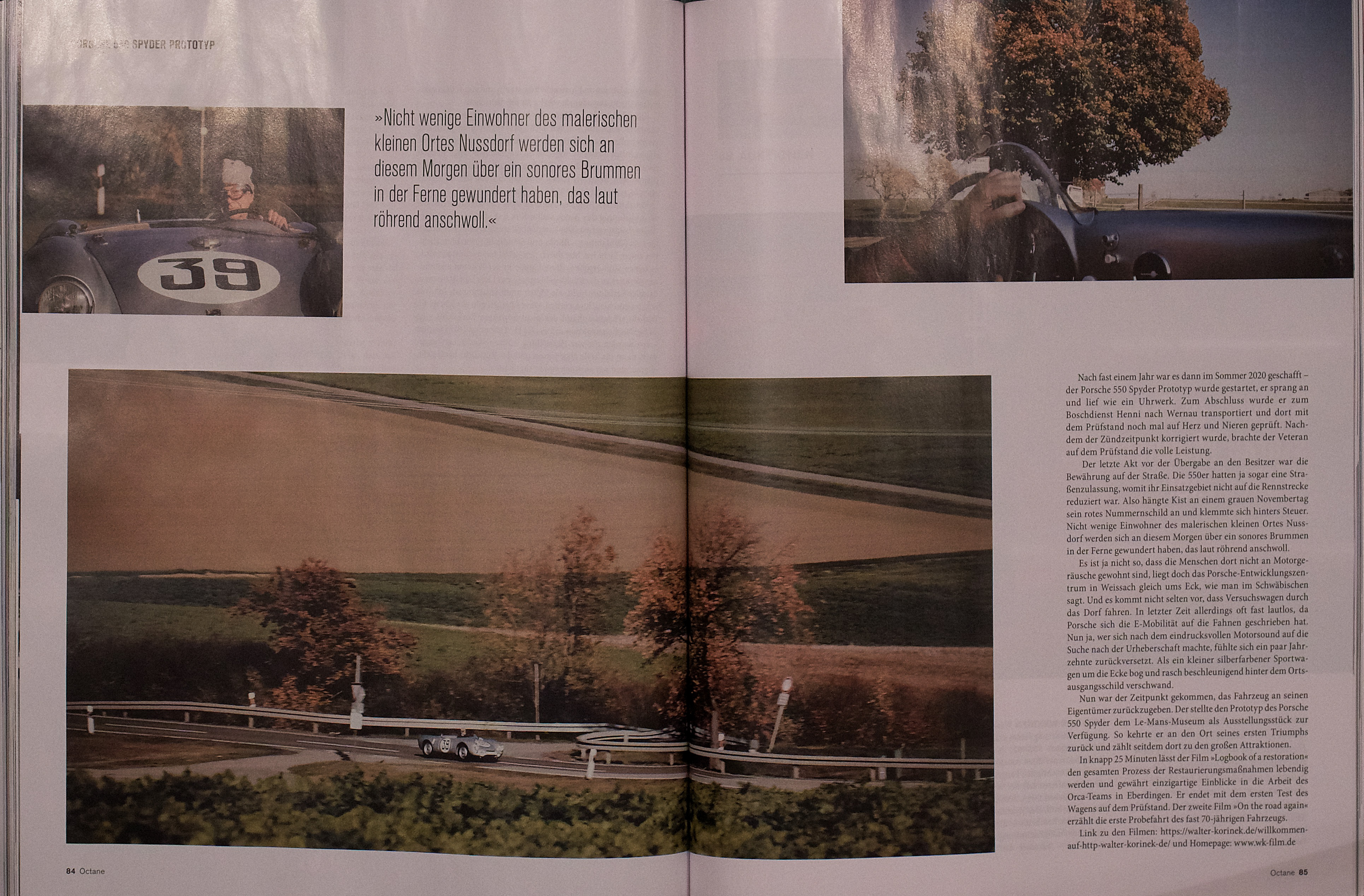 Zwei Filme über die Restauration eines Kultautos – des Porsche 550 Spyder Prototyp aus dem Jahr 1954. Beide Filme widersetzen sich der der Schnelllebigkeit unserer heutigen Sehgewohnheiten und schildern in ruhigen Bildern – eben dem Thema klassischer Fahrzeuge angemessen – die Restauration und die erste Probefahrt dieses einzigartigen Autos. Und trotzdem oder vielleicht gerade deshalb wurden beide Filme in den sozialen Medien viral und der erste Film wurde bis heute auf meinem YouTube-Kanal über 17.000 mal aufgerufen.
